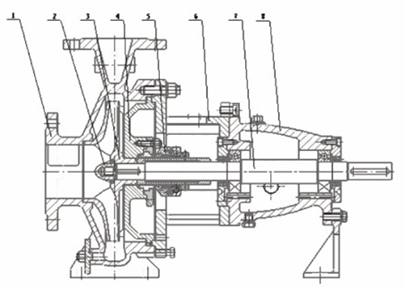 (1)泵體(tǐ);(2)葉輪螺母(mǔ);(3)葉輪件;(4)泵(beng)蓋;(5)密封部(bu)件;(6)中間支(zhi)架;(7)軸;(8)懸😄架(jià)部件
